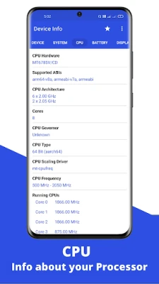 β’ Processor, CPU Hardware, Supported ABIs, CPU Architecture, Cores, CPU Family, CPU Governor, Frequency, CPU Usage, BogoMIPS.